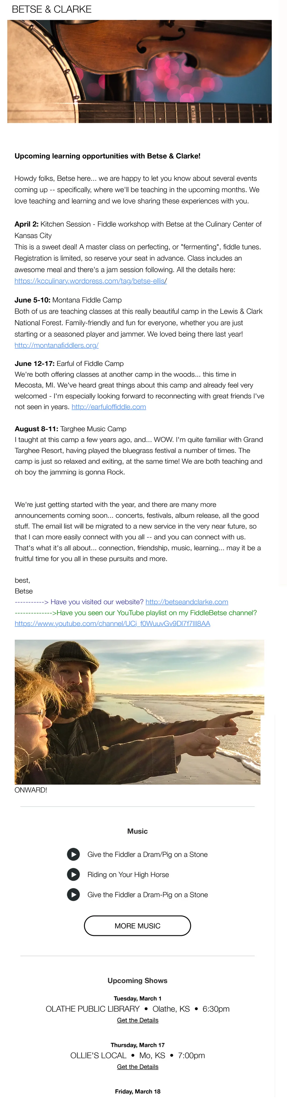 Here's our latest newsletter... a low-tech cut&paste version anyway! We're about to port our email list to a magical land where it's easier to create and maintain our communications and also to hear from you. So please stay tuned... all the links listed below are accessible through our tour page... http://betseandclarke.com/tour ... hope to see you at a workshop or camp soon!